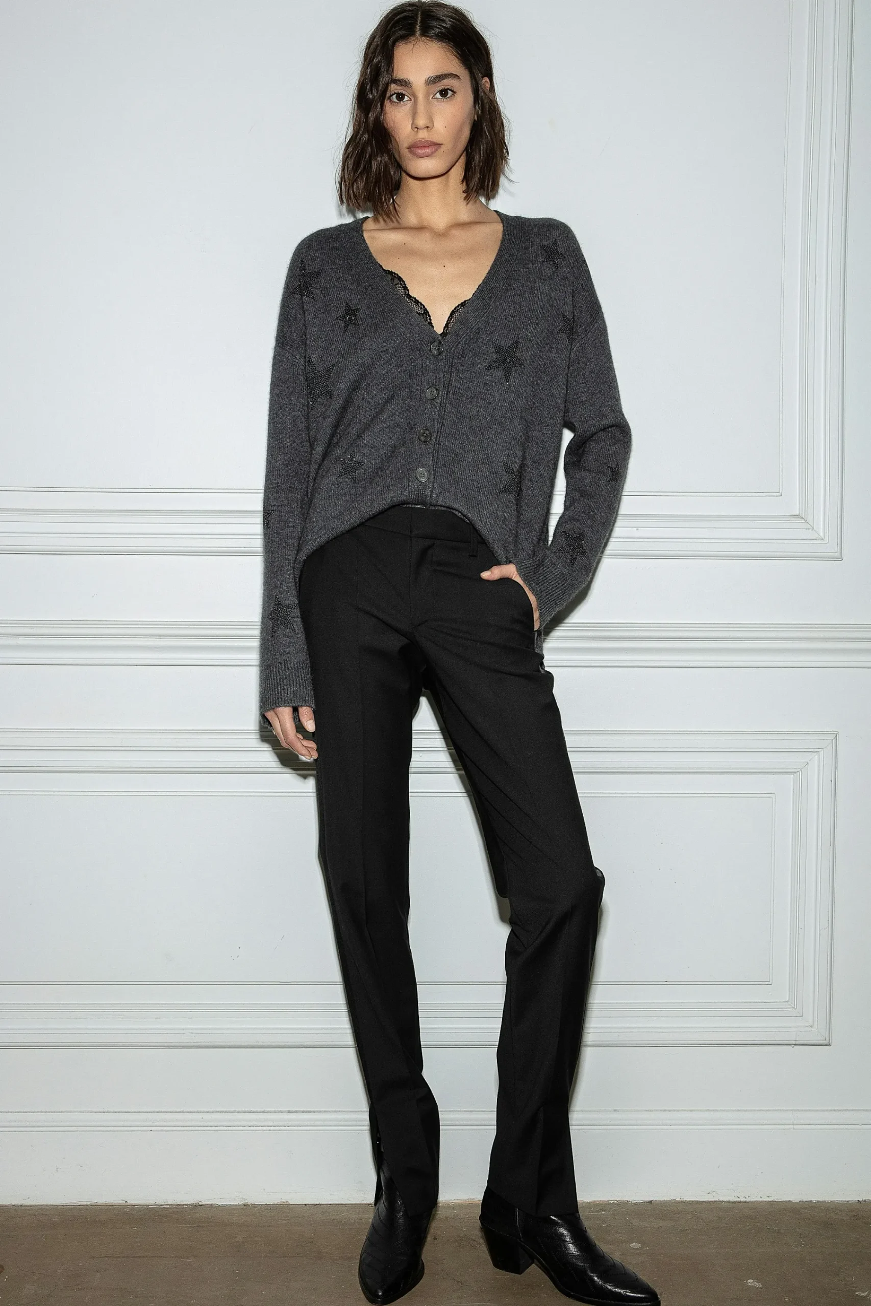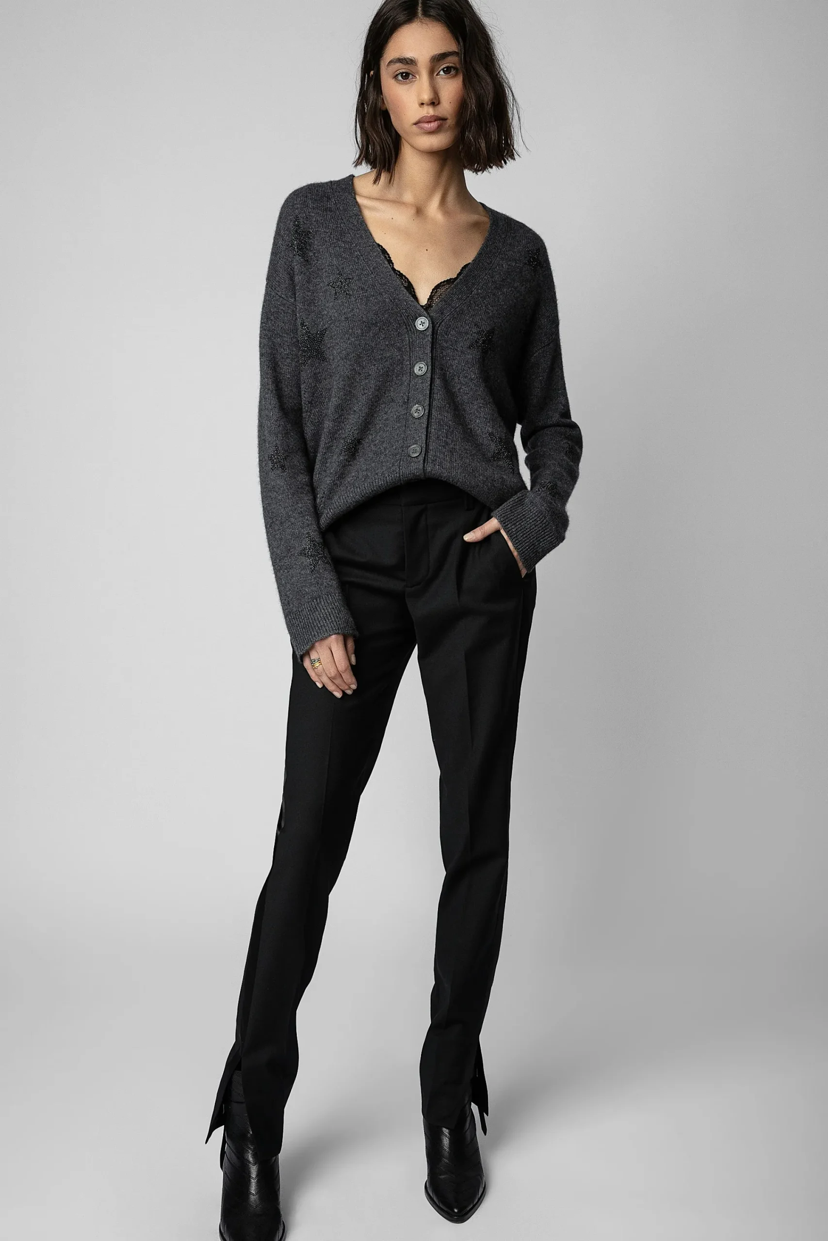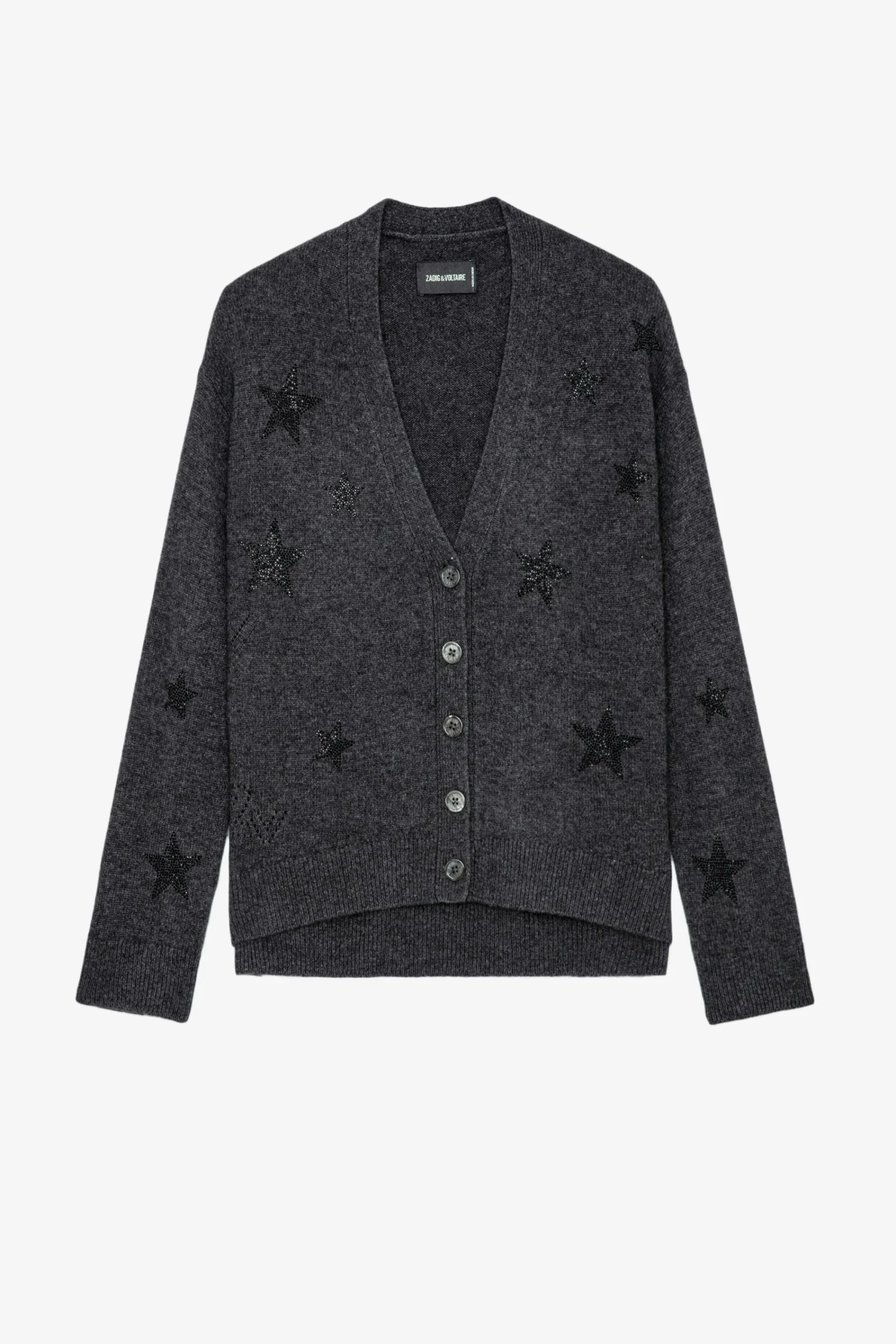 L’Incontournable Cardigan En Cachemire Mirka Se Décline Cette Saison En Gris Anthracite. Doté De Manches Longues Et D’Une Fermeture Boutonnée, Il Présente Des Motifs Étoiles En Strass Contrastés Sur Toute La Surface.